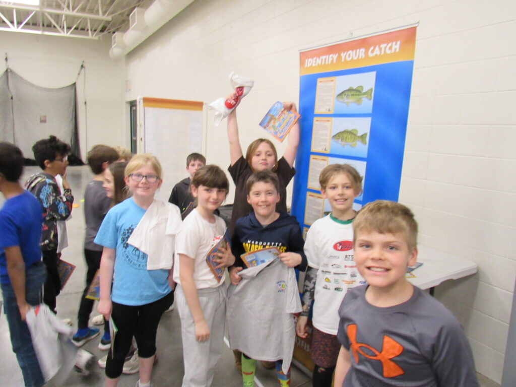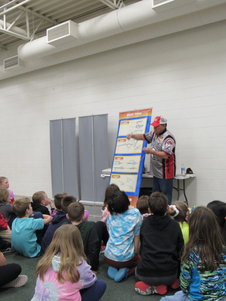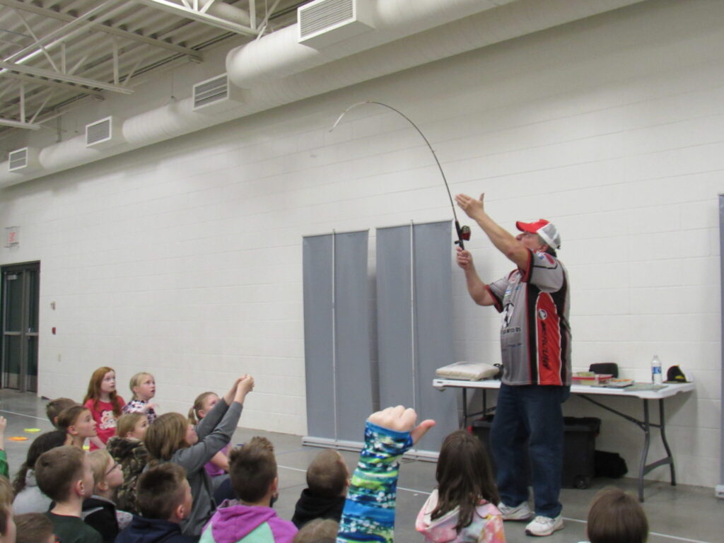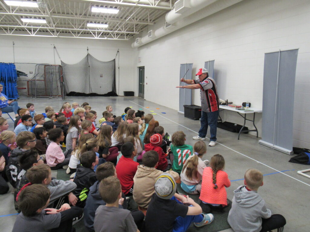 On March 21st, Captain Greg presented two sessions of Fishing Basics to the third graders of Woodland Elementary. This marked the thirteenth year that Captain Greg has visited Woodkand Elementary. The students were so excited to learn the skills and equipment needed to fish as manu of them have never fished. The afternoon started off with the students learning safety while fishing. They then learned about the different fishing combos and how to cat with them. This was followed by simple fishing prersentations and how to tie a Clinch and Palomar knot. Captain Greg asked what else do we need to know to go fishing they yelled out bait and what fish we are going to catch!! So they cover live and artificial bait and fish identification. In each session Captain Greg asked stuidents why a musky is important in Wisconsin? Many said they are big but a couple students in each session knew it was are state fish!! They were rewarded with a hat. Then Captain Greg cover Clean Drain Dry message and whay it is so important to follow so we keep our waterways in tip top shape.