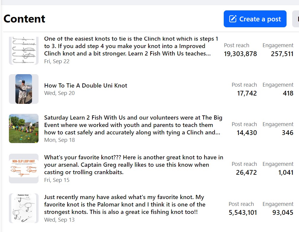 This past month, Learn 2 Fish With Us Facebook went viral!!  Learn 2 Fish With Us post an average of two to three fishing educational post per week which includes fishing videos, tips and our in-person fishing events.  Last month we had two knot post, that went viral.  The first post was a Palomar knot, and Learn 2 Fish With Us had just over five million reached.  The second post, was the Clinch and Improved Clinch knot, which had just over 19 million reached.  These post had thousands of comments and theses post were shared nearly ten thousand times!!  Learn 2 Fish With Us now has many new followers from all across the globe, showing how important it is to sharing our fishing education!!