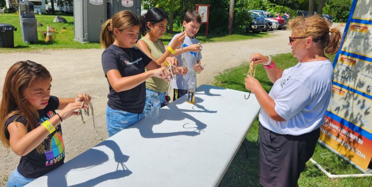 Learn 2 Fish With Us had a fishing educational booth at the Ojibwa’s Youth Outdoor Day, taught youth how to cast safely and accurately, tie a Palomar and Clinch knot, fish identification, safety while on the water and Aquatic Invasive Species. During the day you heard the youth yelling, ‘got another’, or missed one while fishing for backyard bass in their casting booth. Besides youth, adults also liked learning the how to tie the different knots.