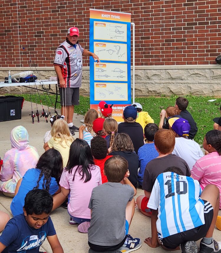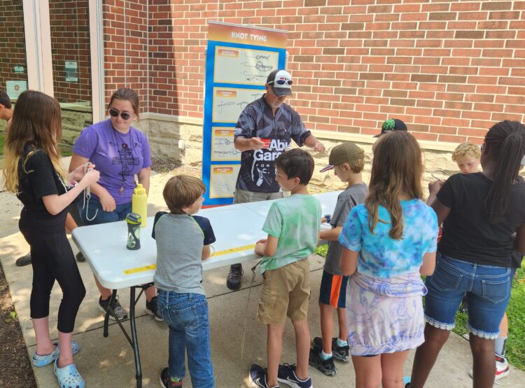 Fish Camps second session was hosted for youth between the ages of 7 and 8 and the third session was hosted for youth ages 9 to 13.  In the second and third session youth first attended our Fishing Basics seminar where they learned the skills and equipment needed to begin fishing.  After the seminar youth attended three hands on educational stations.  The first station youth learned how to cast safely and accurately.  The next station youth tied a Clinch and Palomar knot.  Final station, youth learned how to identify the different fish along with learning the different bait we use to fish.